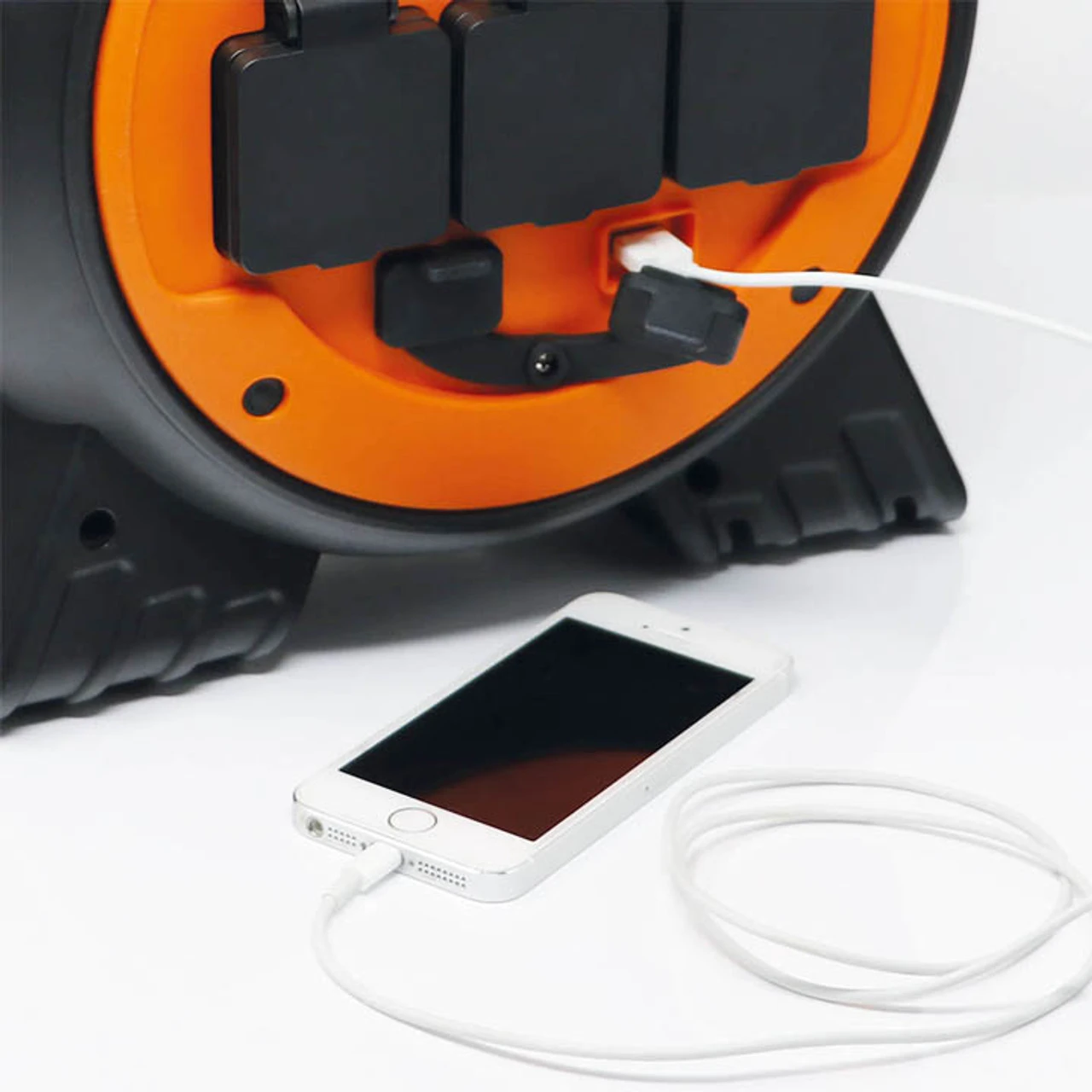 15m roller mobile mains power unit with LED light is a 5 in 1 power supply for all your modern appliances!
