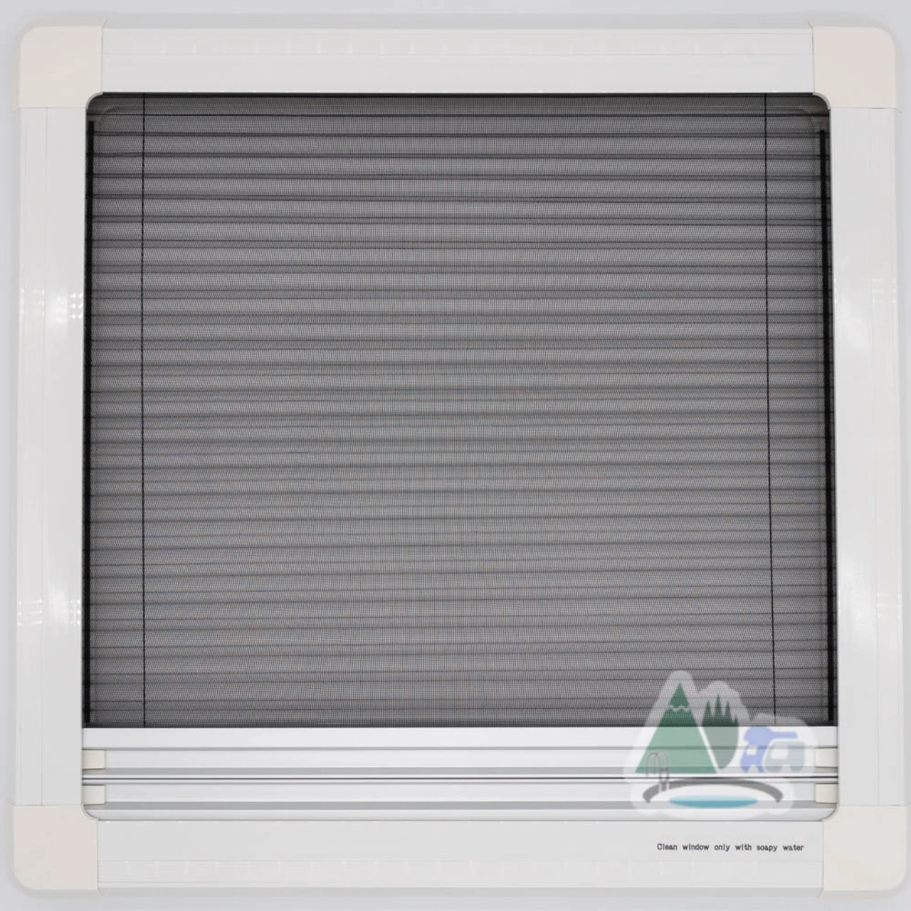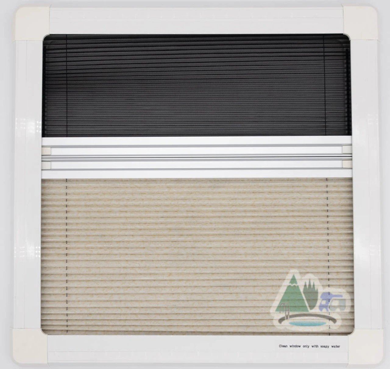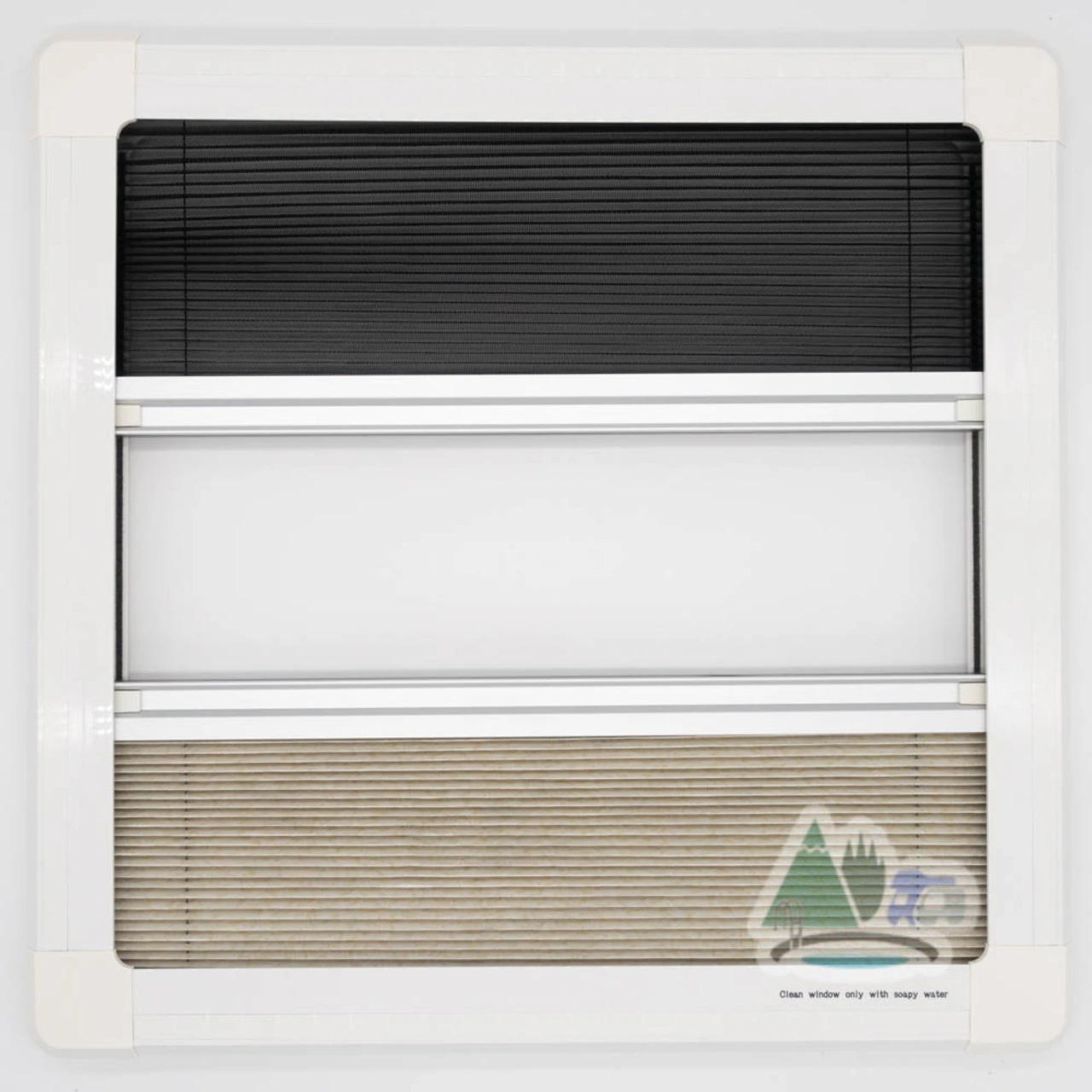 The inner frame features two integrated blinds – both a fly screen and a full blind. The fly screen is made of a fiberglass mesh, giving it a rugged durability and allowing ventilation. The full blind has a reflective rear to keep your camper-van, caravan or motor home insulated. You can also mix-and-match your use of these top hinge blinds, with magnets allowing them to hold position in the middle, and black tensioning screws allowing you to easily adjust tension at the top.