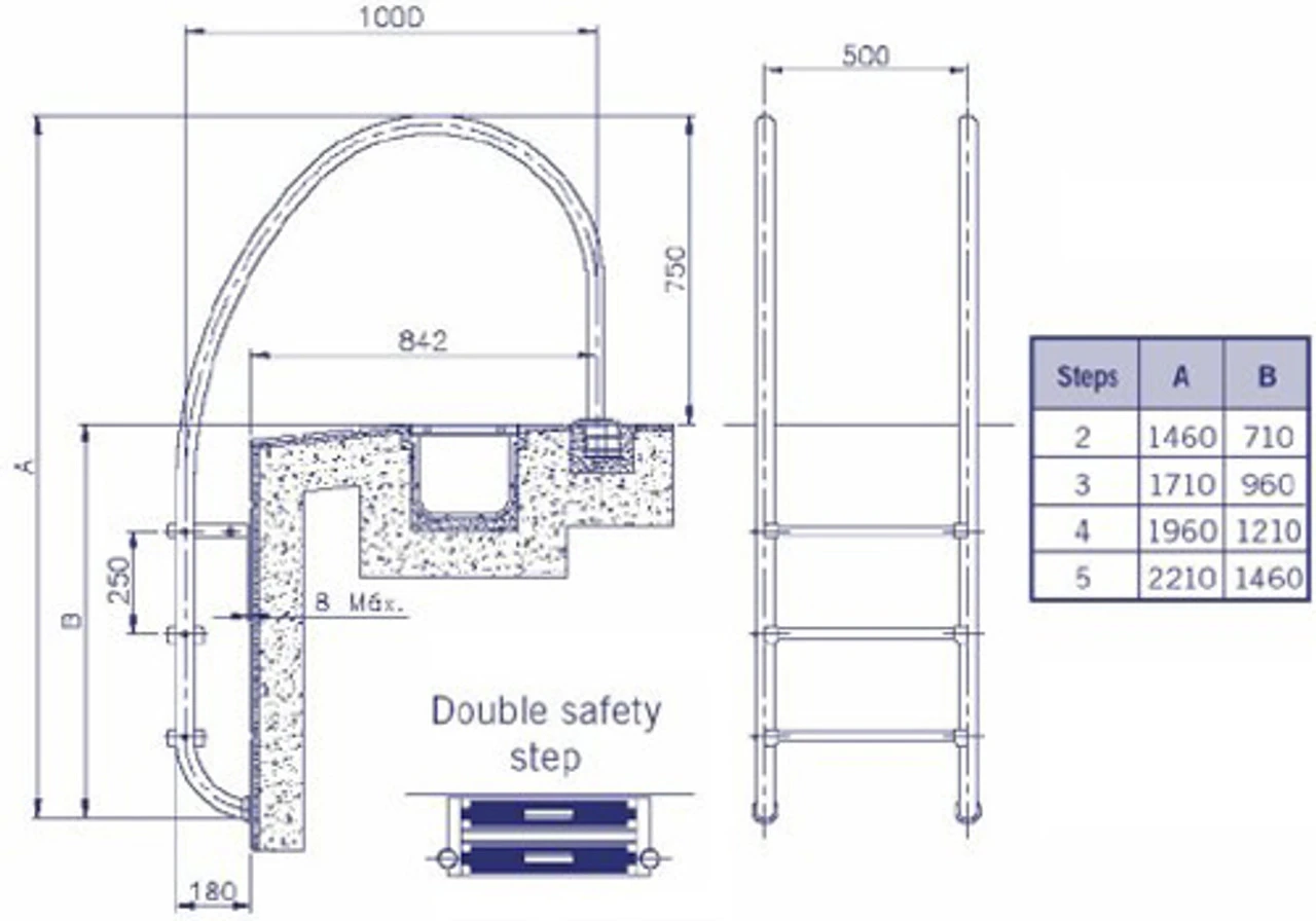 With a ladder width of 500mm and extra wide Ø 43mm stainless steel handrails, the Astral Overflow Swimming Pool Ladder is designed for installation above overflow and comes with fixing anchors and earth connection.