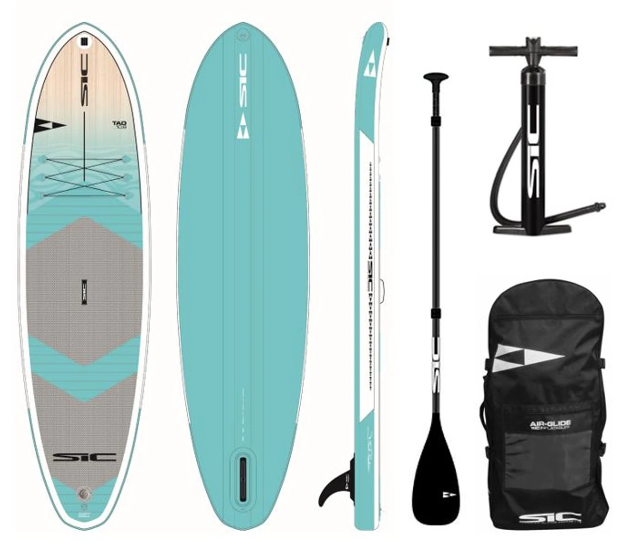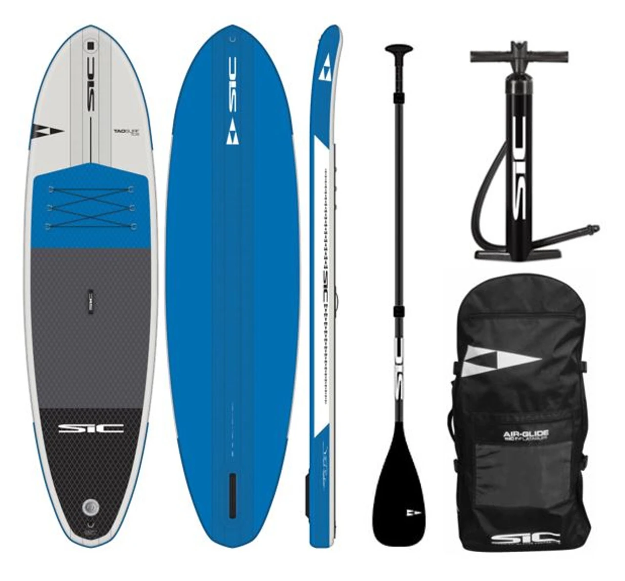 SIC paddle board’s are a great choice for beginners and general leisure paddlers. This premium inflatable SUP can be inflated and deflated in minutes and can be easily folded and packed into its carry bag – ideal for storage and transportation in your car or campervan! This premium iSUP offer maximum time on the water. The SIC Tao Surf Air Glide10′ 6 inflatable paddle board is ideally suited to beginners and is designed for paddlers who want a board to take out with the family, surf small waves or explore the coastline. The 11’0” and 12’6” are faster and designed more for recreational fitness and cruising. This SIC Tao Air Glide is made from the finest Drop Stitch Construction (DSC) and lightweight and durable Support Stringer Technology (SST). More durable than standard hard boards the SIC Tao inflatable boards are light, stiff, and reliable. They come packaged with a three-piece adjustable paddle so that you are ready to go out of the box.