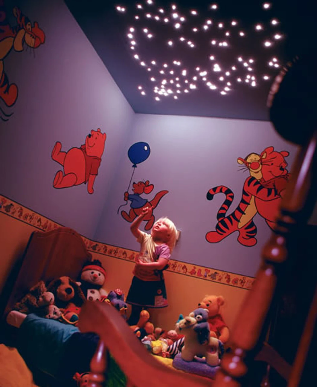 This kit comprises halogen light box with twinkle wheel and tails. Once turned on the wheel turns (inside the light box) in front of the light causing the twinkle affect which appears at the end of each tail. Its “blue and white” twinkle wheel gives the best “twinkling star affect” for your ceiling. Each kit includes optional lenses, having a mix of lights with and without lenses randomly scattered across the ceiling adds to a “real” star affect.