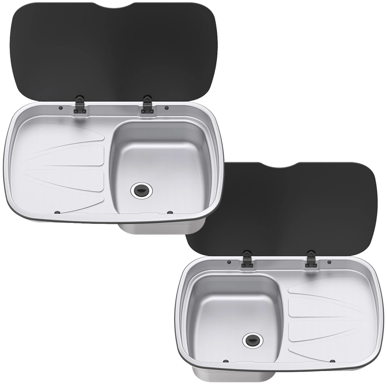 Spinflo Argent Stainless Steel caravan and motor home sink with integrated drainer. It also has a hinged heat-resistant toughened glass lid which adds more workspace when sink is not being used.
