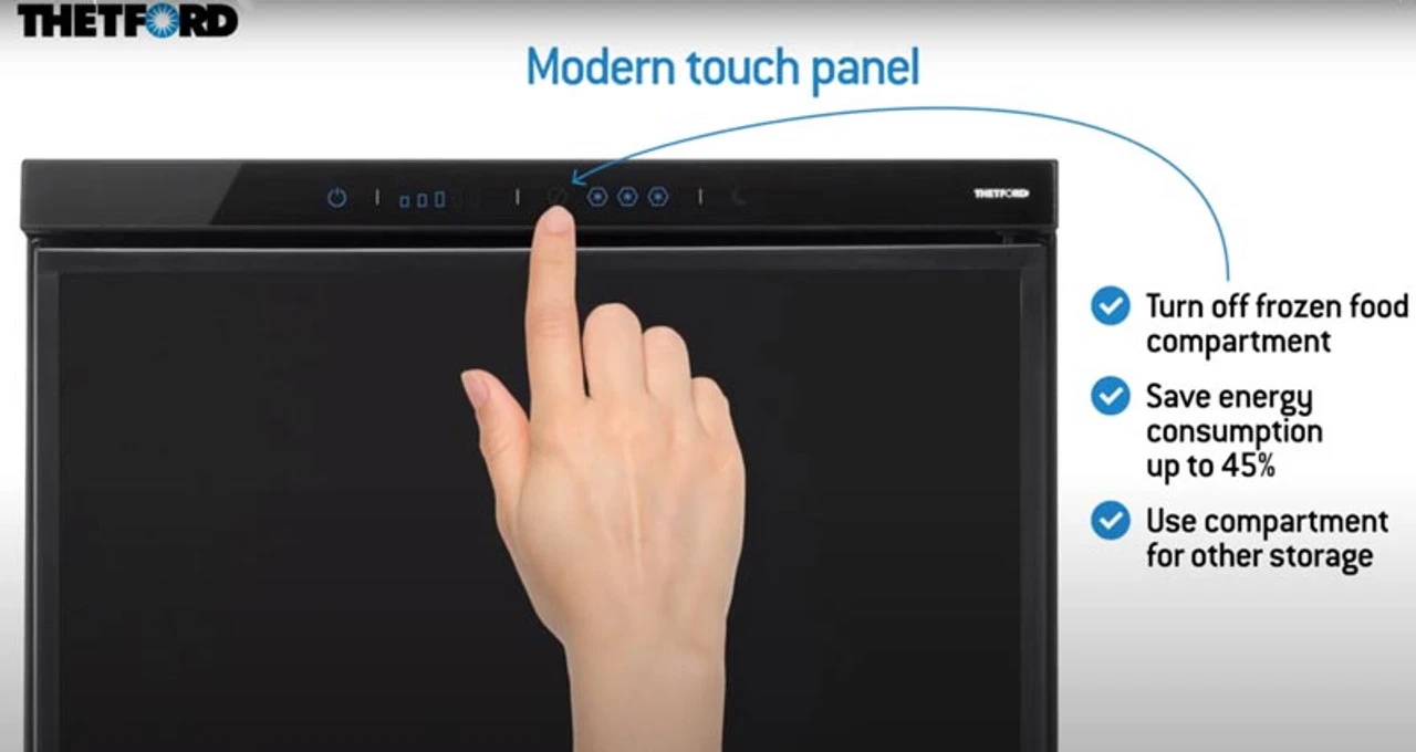 The Thetford T2090 compressor fridge includes an integrated 6 litre freezer compartment, ensuring you aren’t limited in the food you bring on your journey. This freezer space, combined with an additional 78 litres of fridge space, ensures you won’t feel compromised on the road. You can even use the touch panel to disable the fridge freezer if you wish, allowing you to save power.