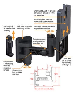 Vision plus supply their Tv wall mounting swing arms with quick release brackets, making it easy to stow away or move your campervan or caravan 12v television. Friction-adjustable hinges also ensure that your arm is never too loose or too stiff, ensuring it moves only when you want it to.