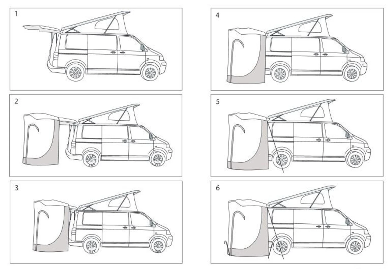 Reimo’s handy tailgate tent fits VW campervans like a glove. This tailgate awning lets you extend your van’s living space, giving you a compact profile on the road, and plenty of space when pitched up.