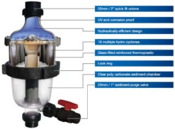 Pool water gets spun through multiple hydro cyclones whilst centrifugal forces in the Waterco MultiCyclone Pre-Filter push dirt into the sediment bowl meaning that 80% of the dirt gets removed by the cyclones, leaving the remaining dirt to be caught by your existing filter for exquisitely clear water.